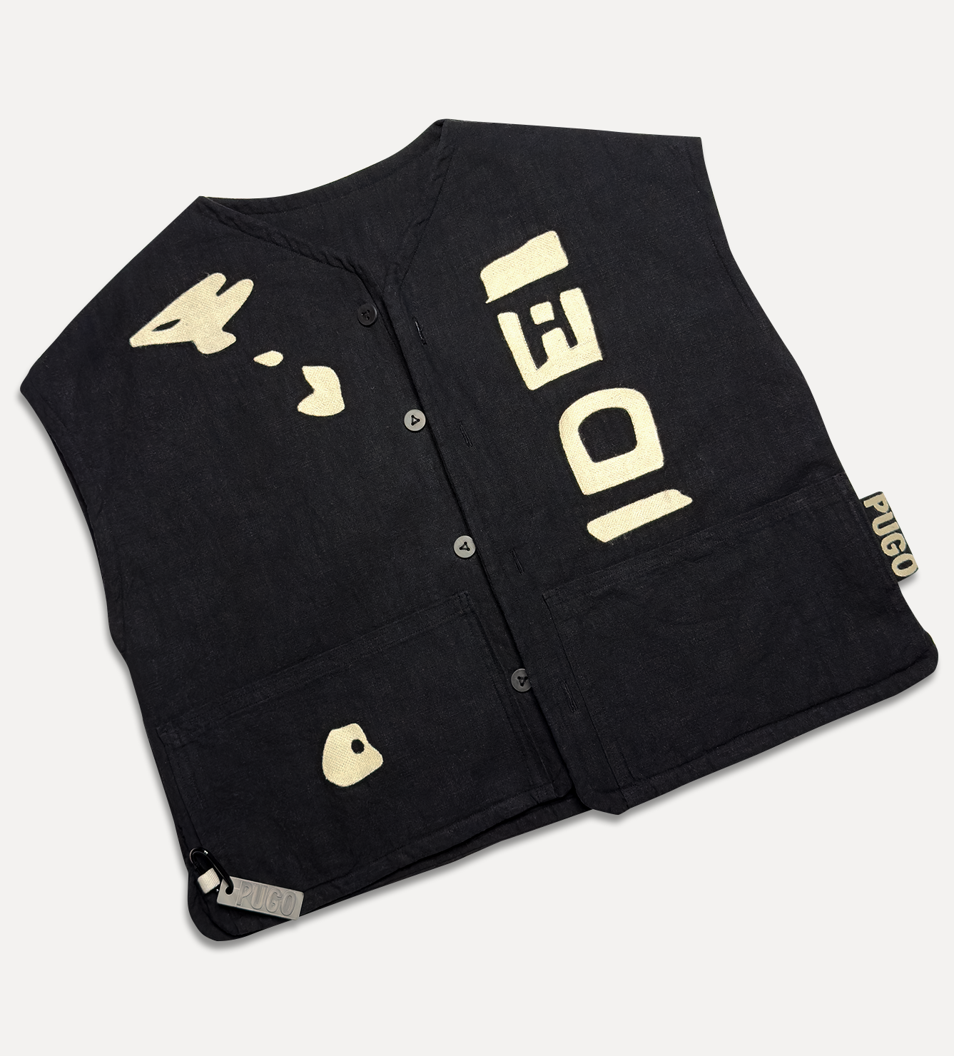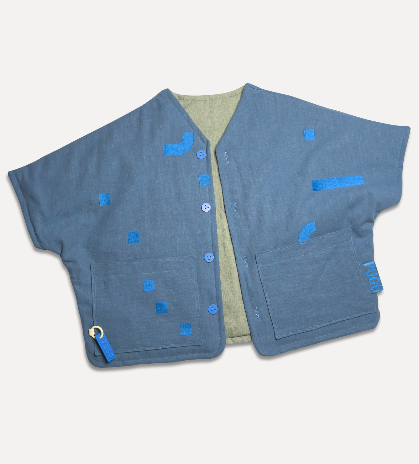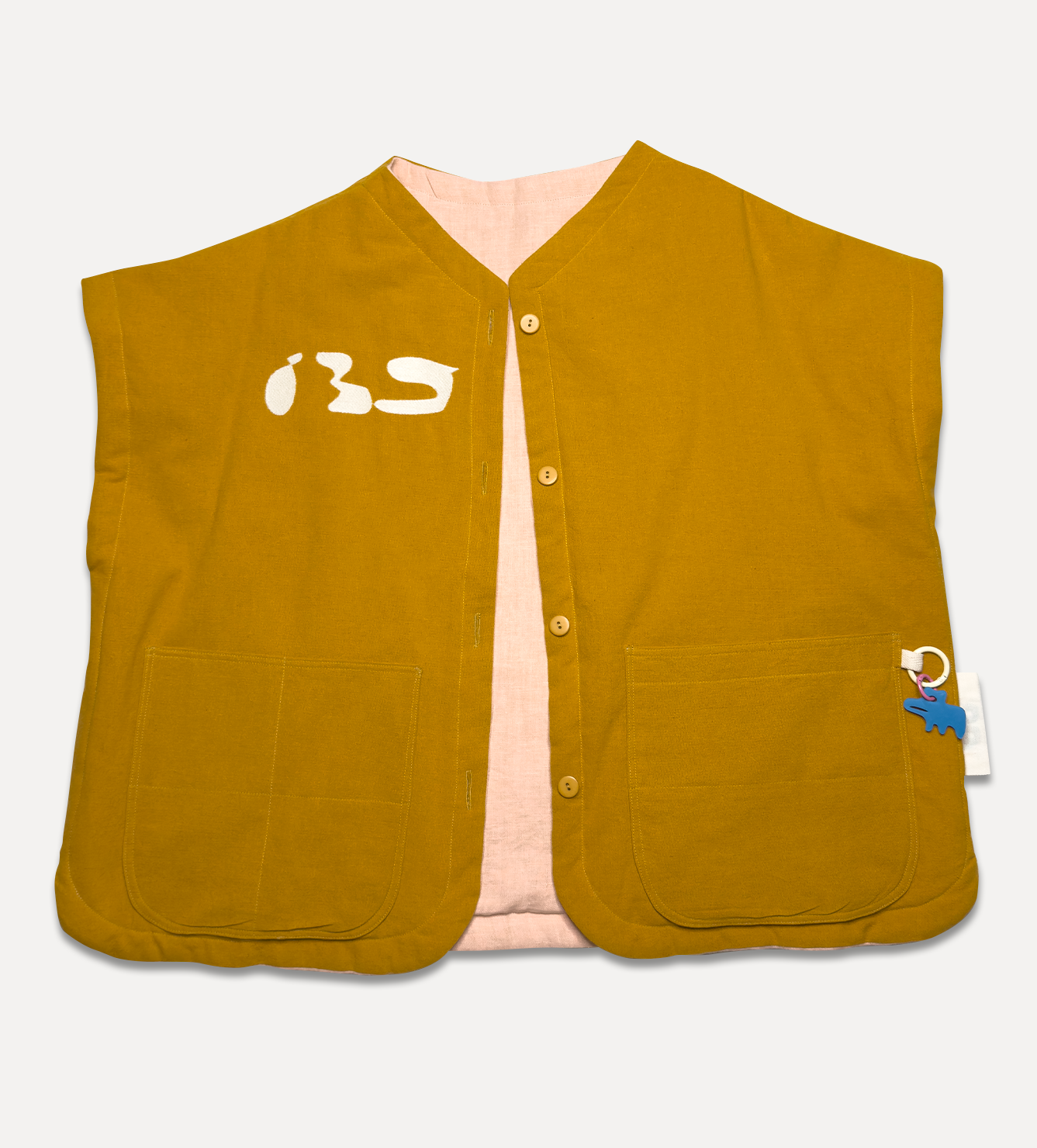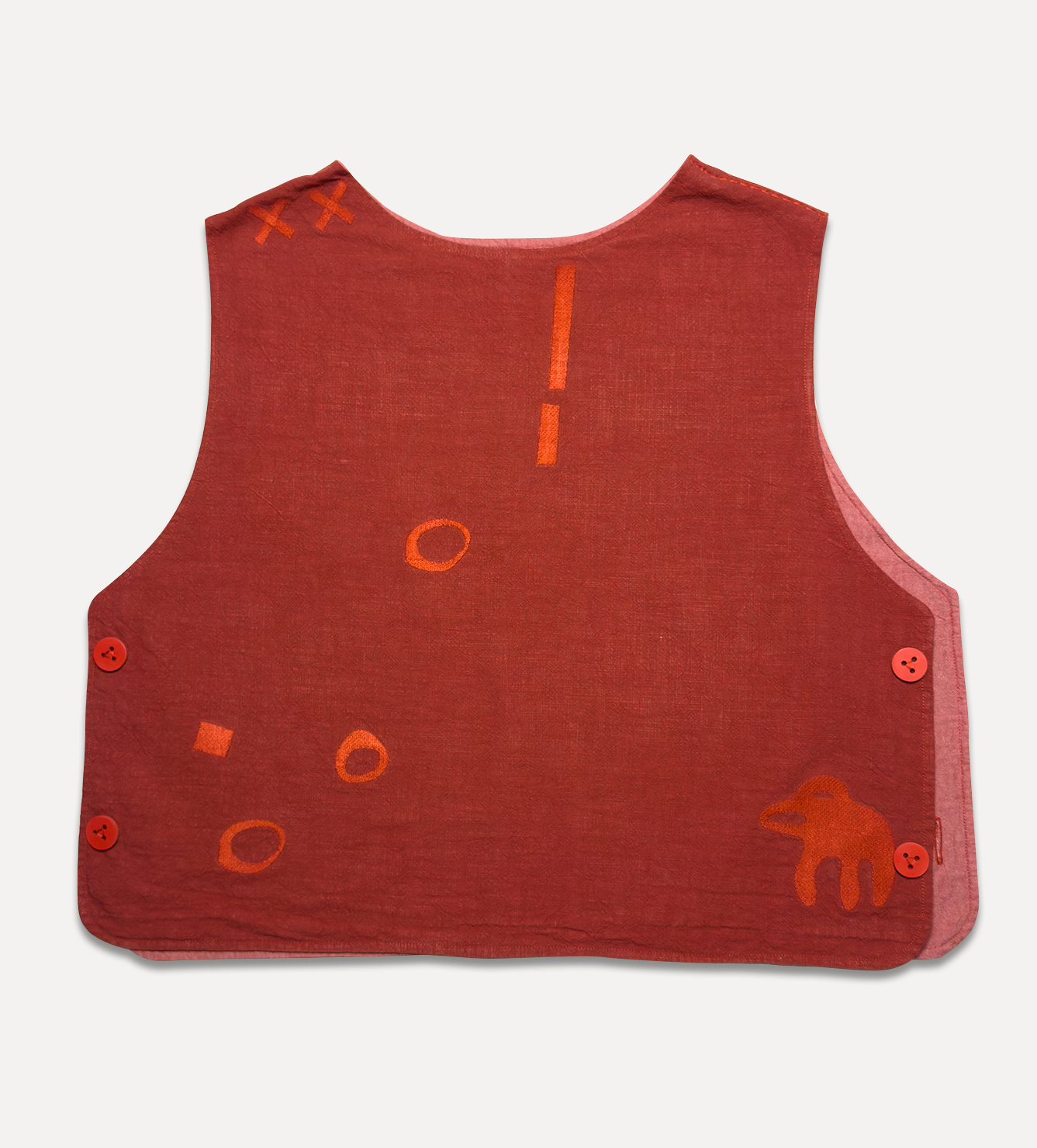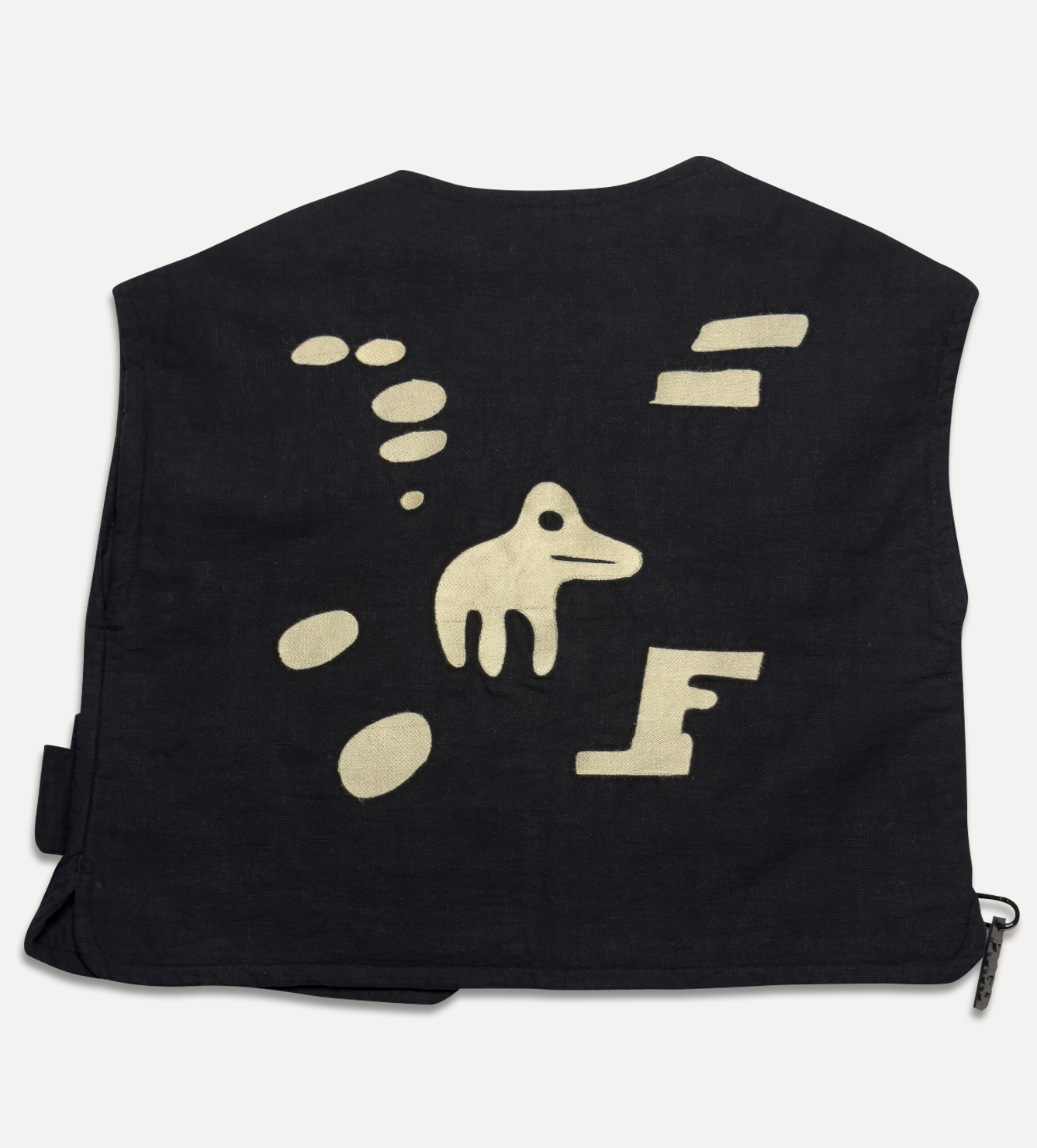 Жилет выполнен из ткани крапива рами с внешней стороны, с аппликацией и вышивкой. Внутри — рубашечный хлопок, утеплитель из хлопка с бамбуком. Стёганая подкладка. Оригинальная графика, пуговицы и брелок.