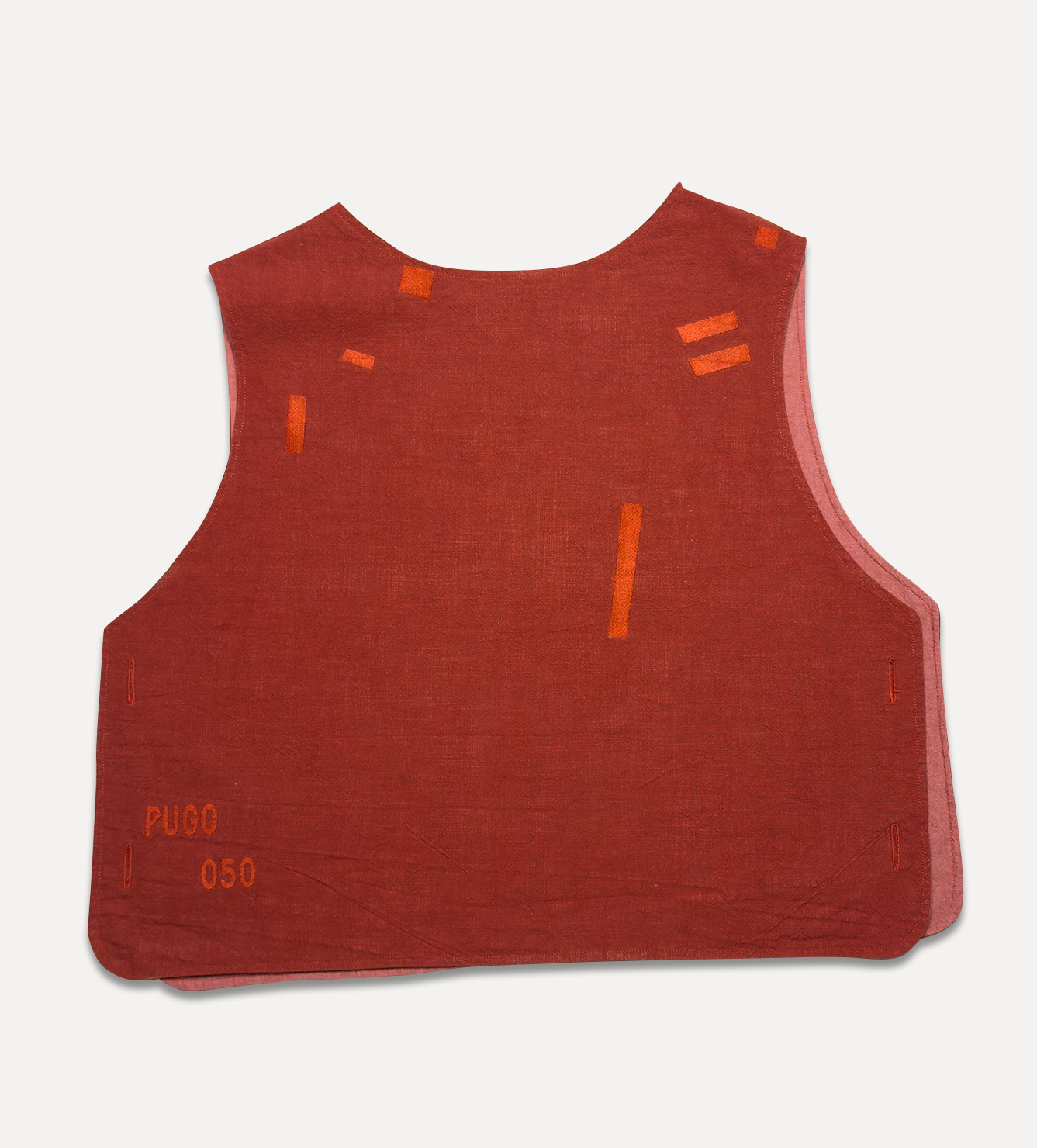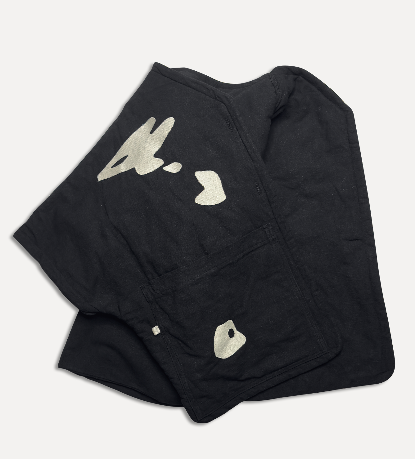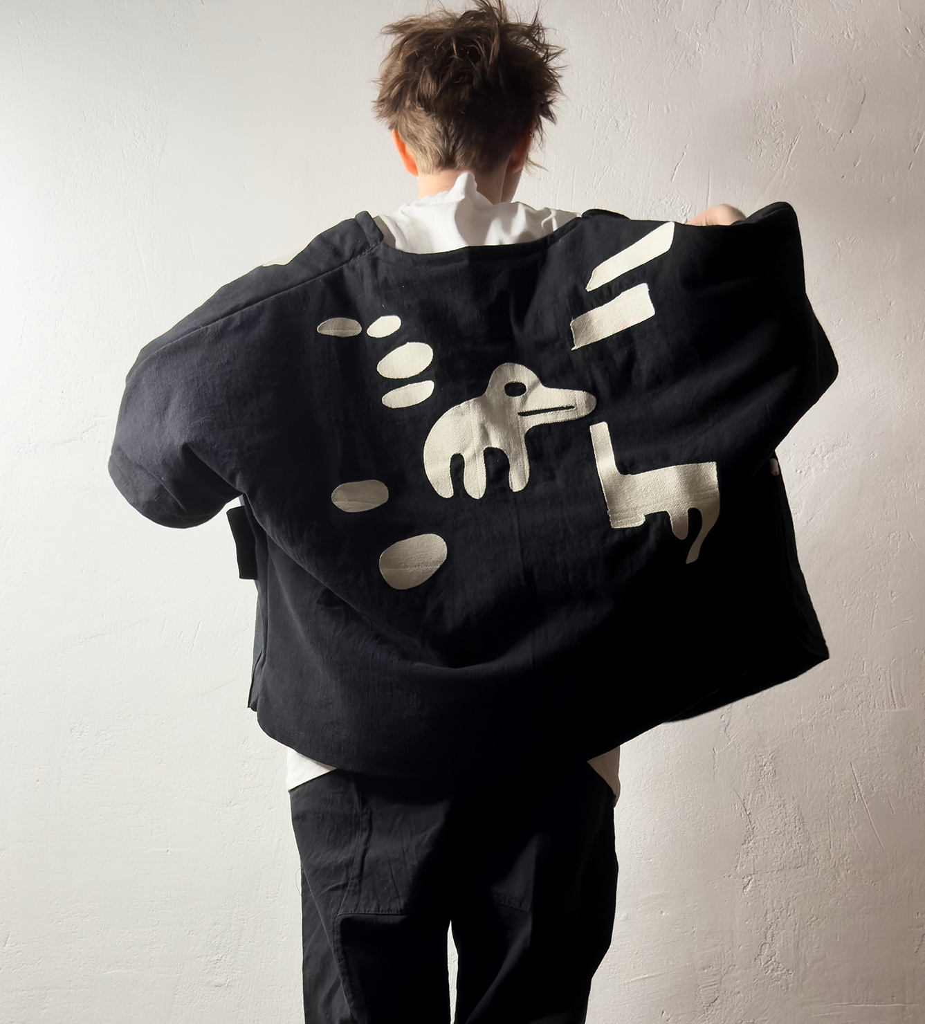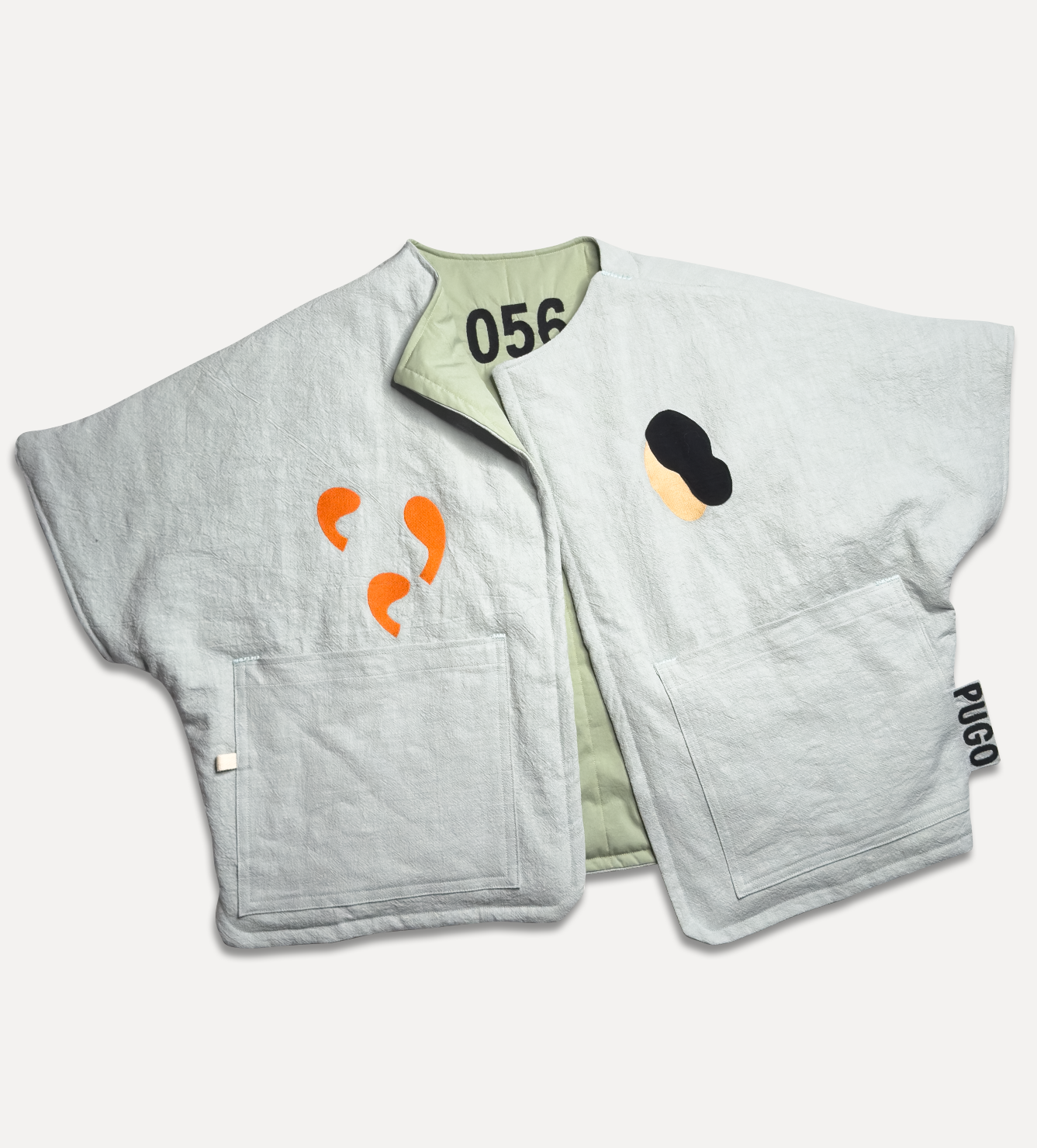 Жилет выполнен из ткани крапива рами с внешней стороны, с аппликацией и вышивкой. Внутри — рубашечный хлопок, утеплитель из хлопка с бамбуком. Стёганая подкладка. Оригинальная графика, пуговицы и брелок.