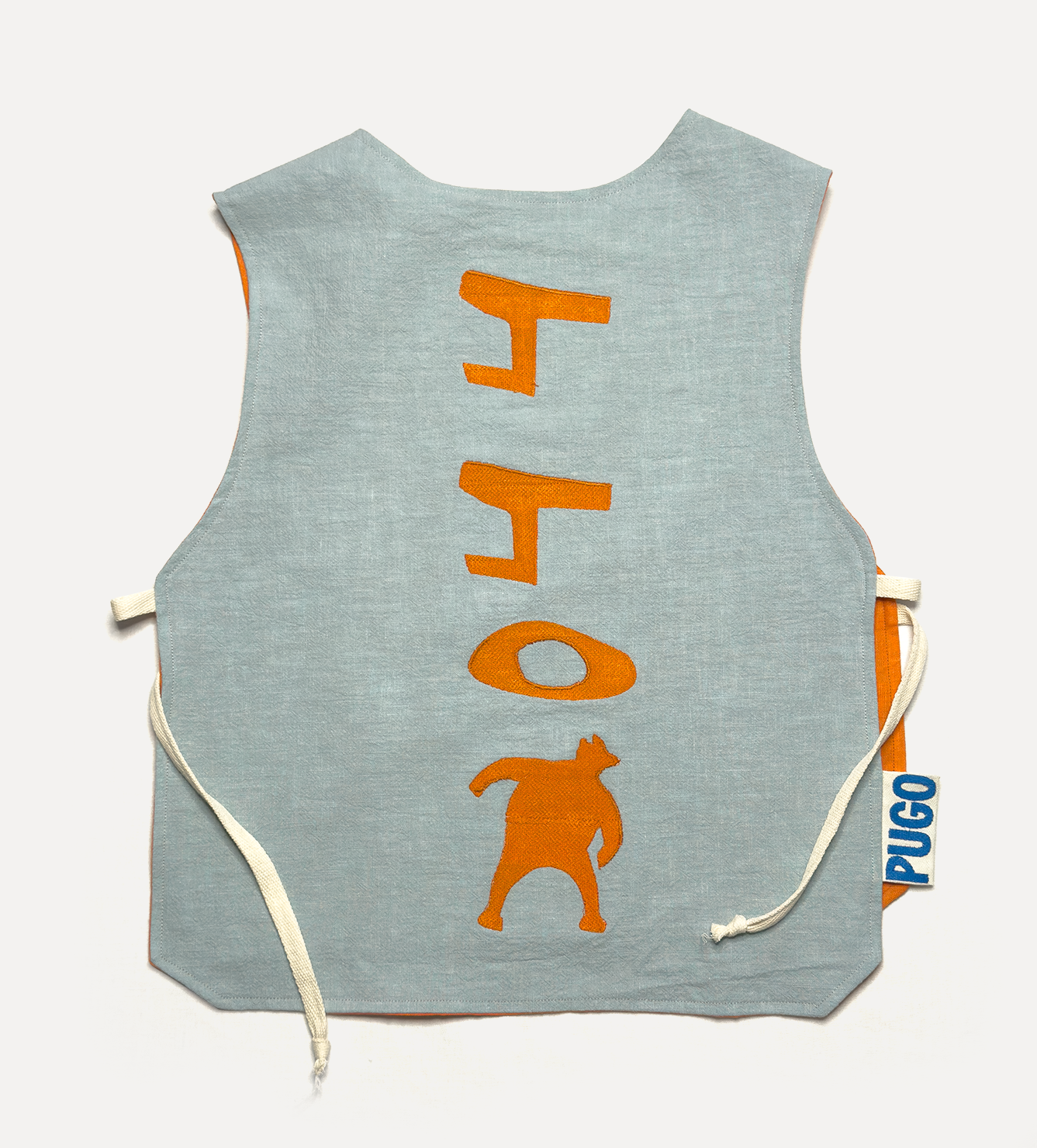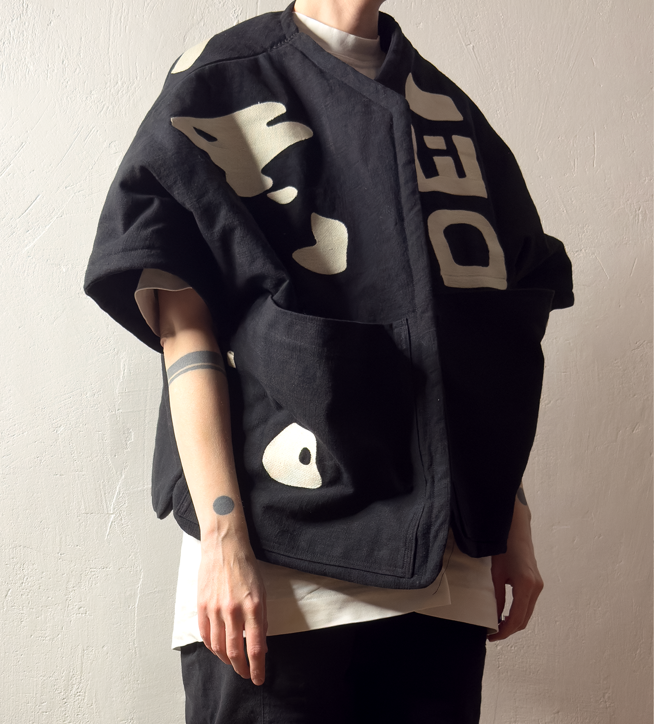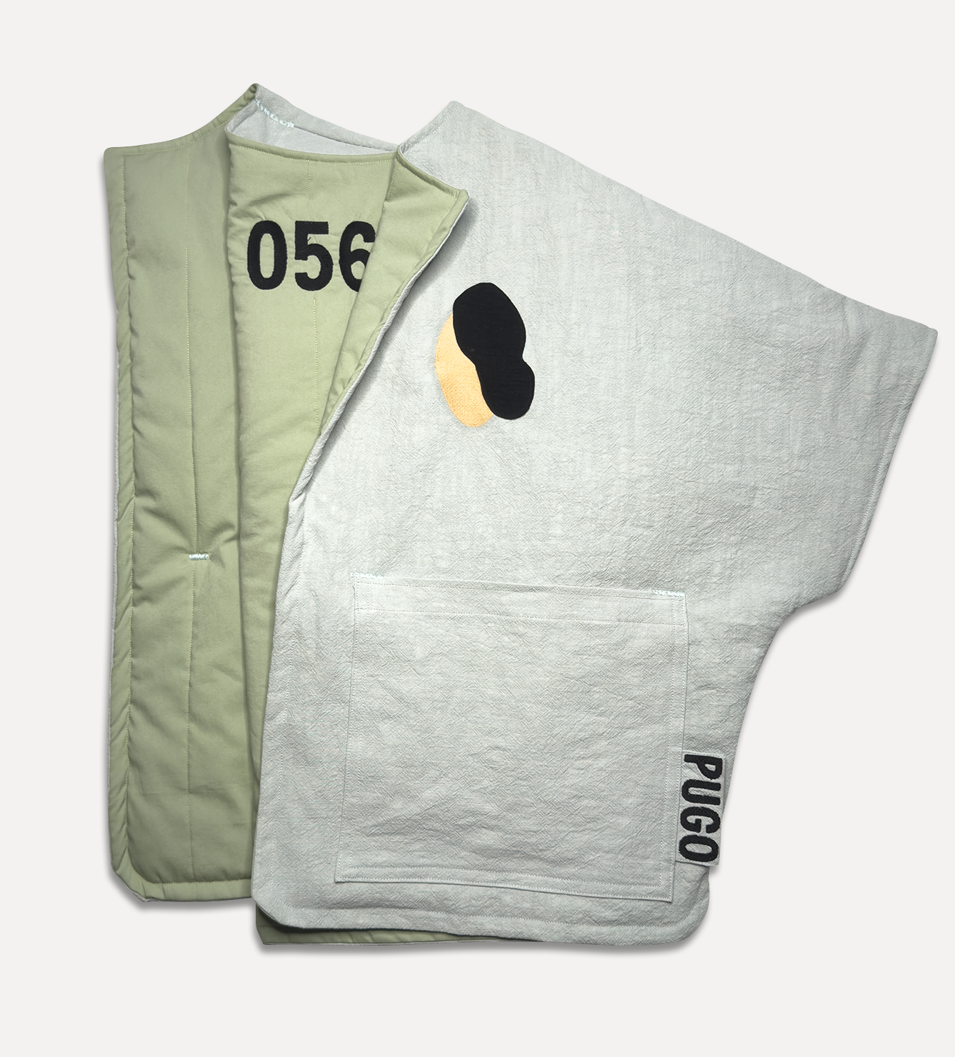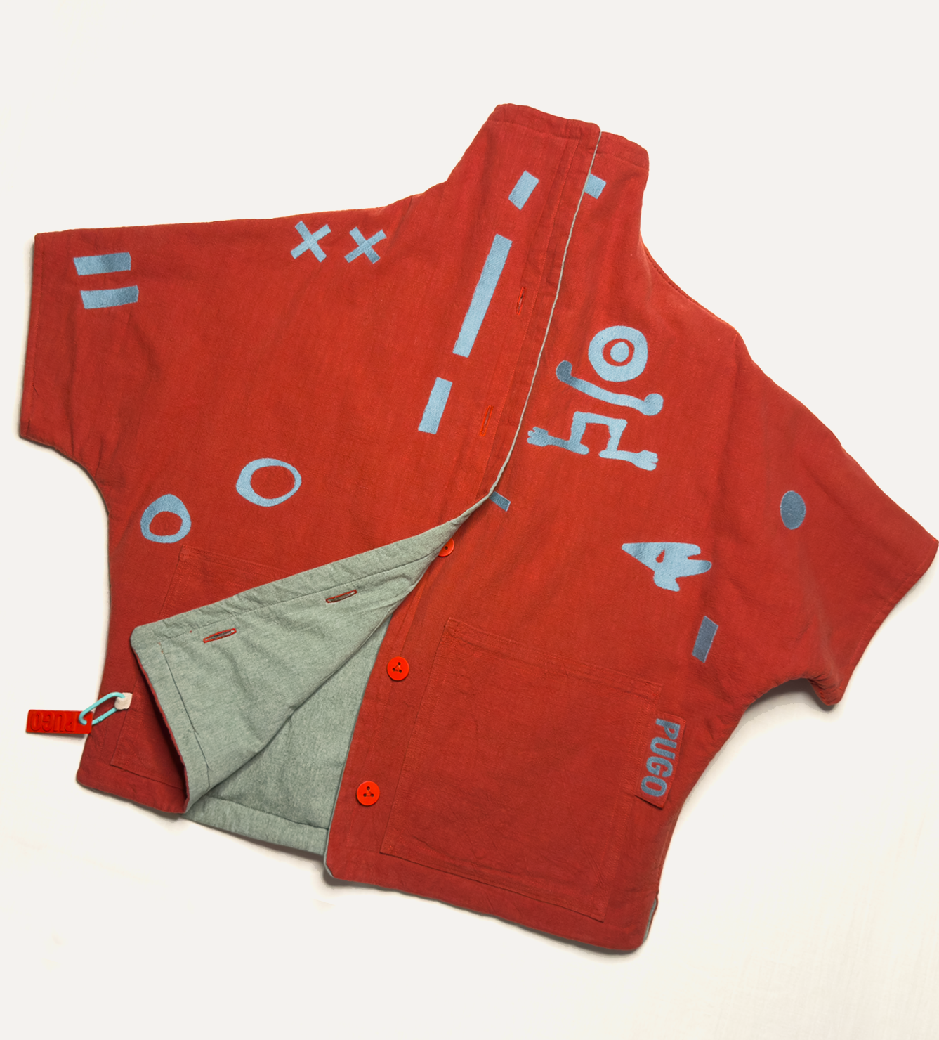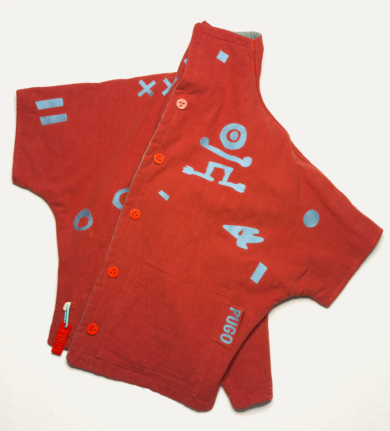 Жилет выполнен из ткани крапива рами с внешней стороны, с аппликацией и вышивкой. Внутри — рубашечный хлопок, утеплитель из хлопка с бамбуком. Стёганая подкладка. Оригинальная графика, пуговицы и брелок.