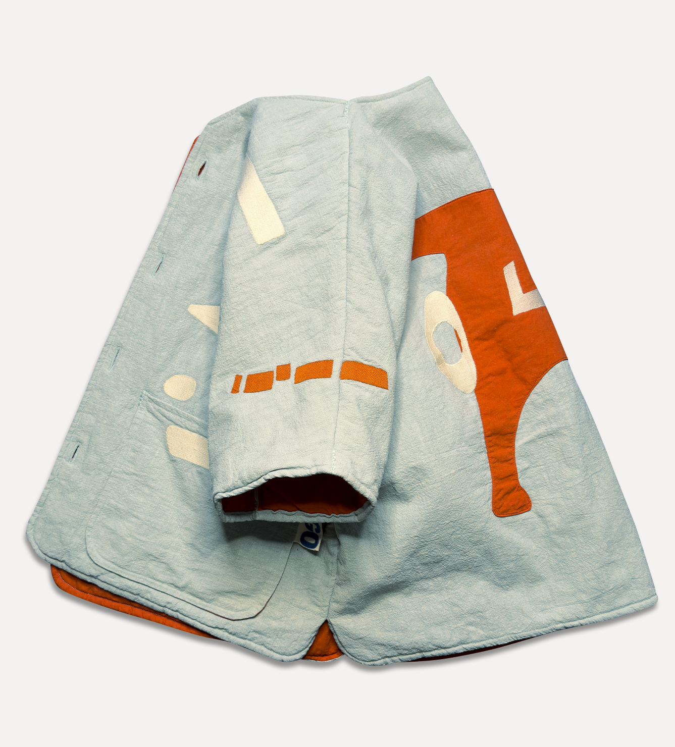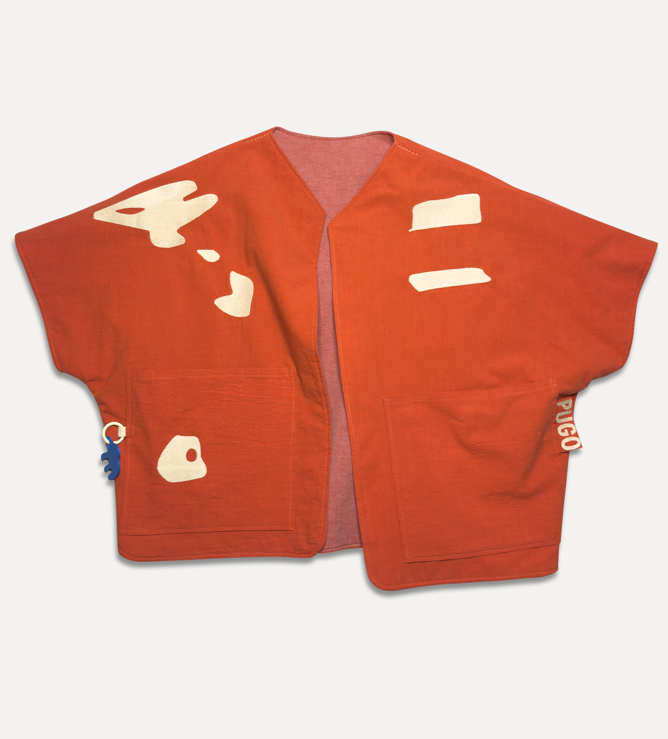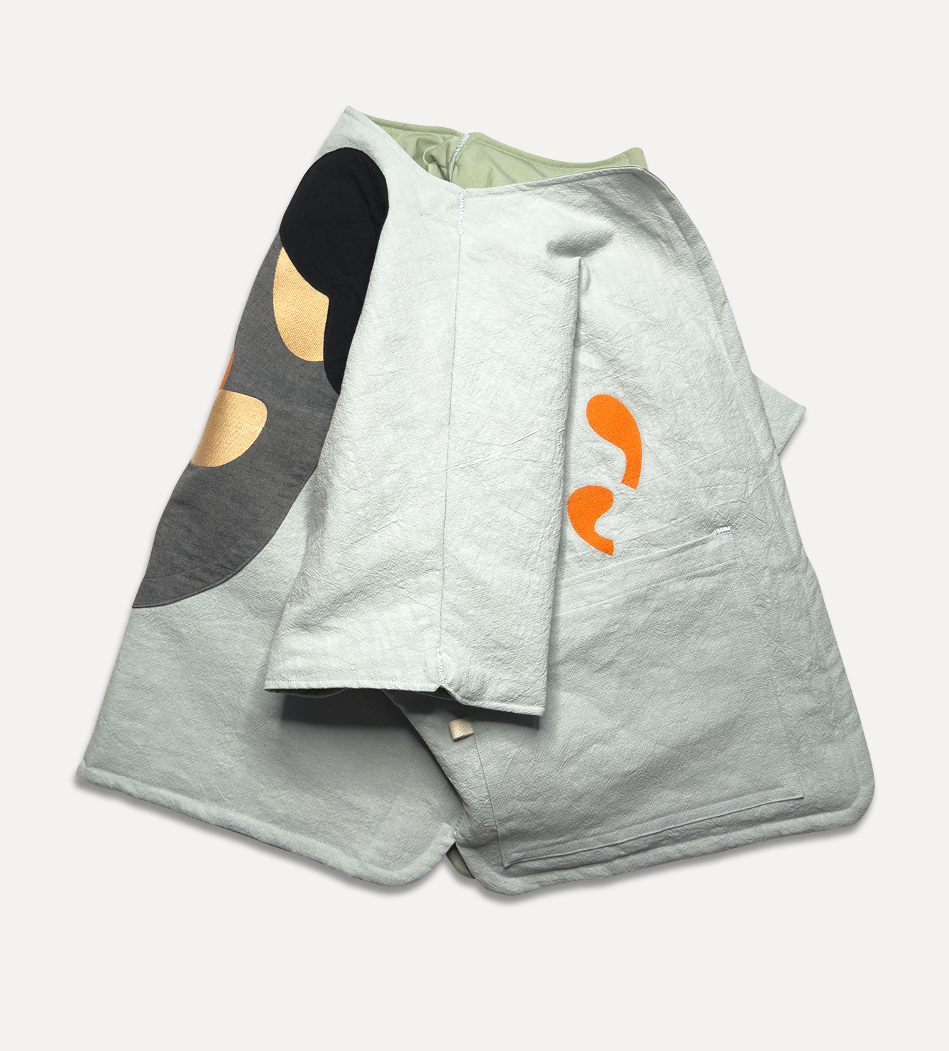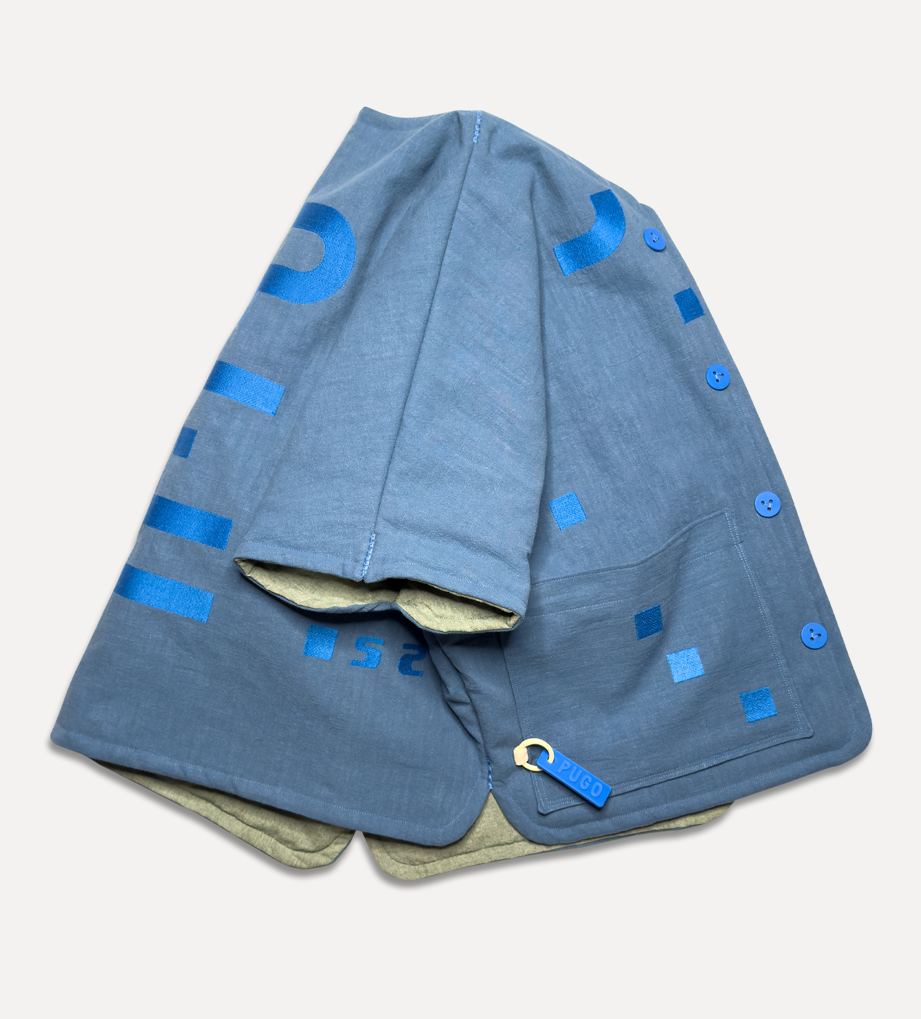 Жилет выполнен из ткани крапива рами с внешней стороны, с аппликацией и вышивкой. Внутри — рубашечный хлопок, утеплитель из хлопка с бамбуком. Стёганая подкладка. Оригинальная графика, пуговицы и брелок.