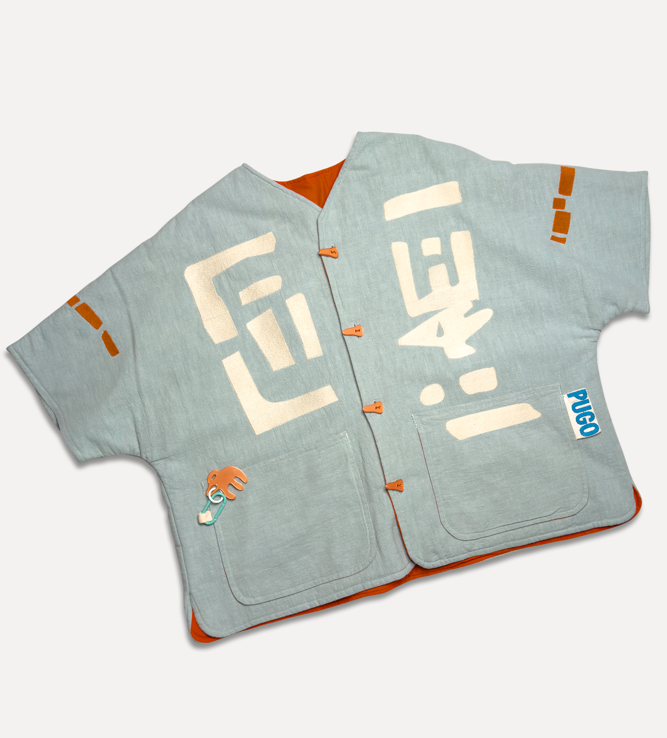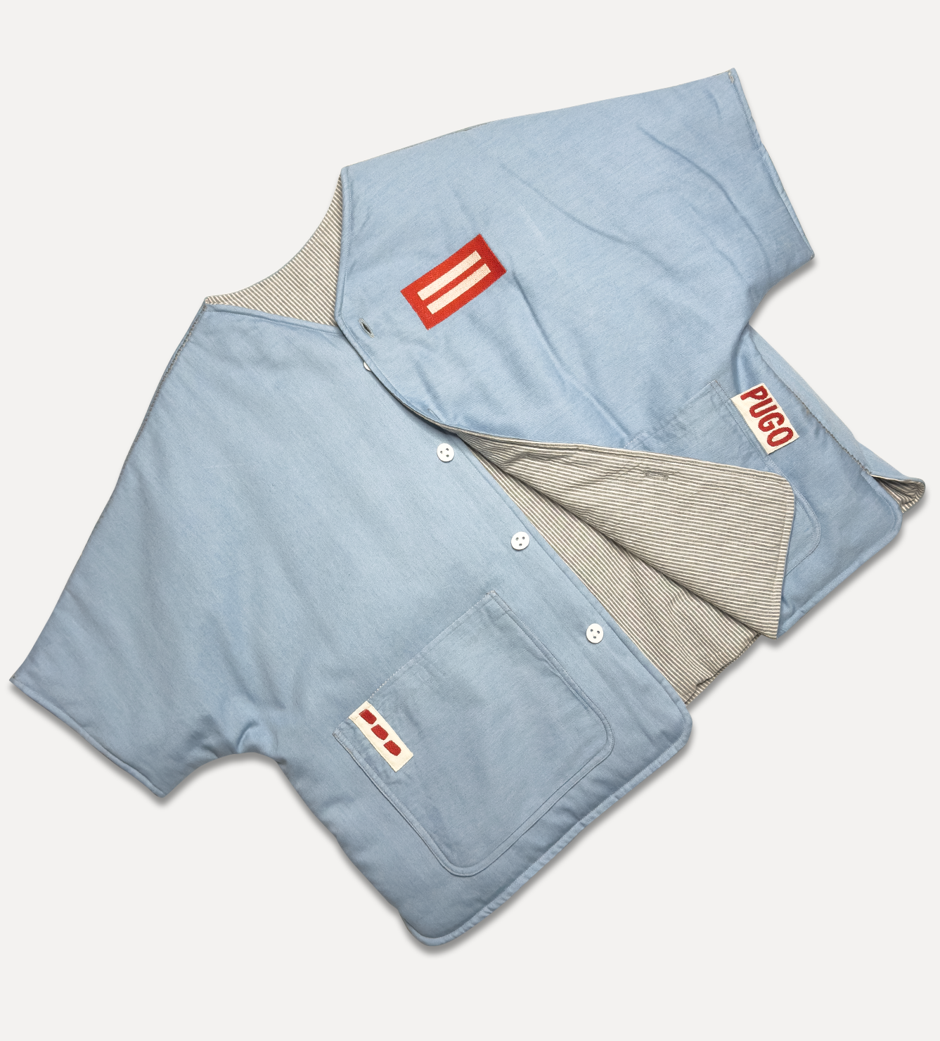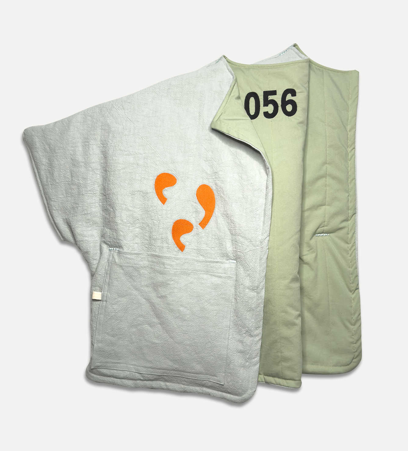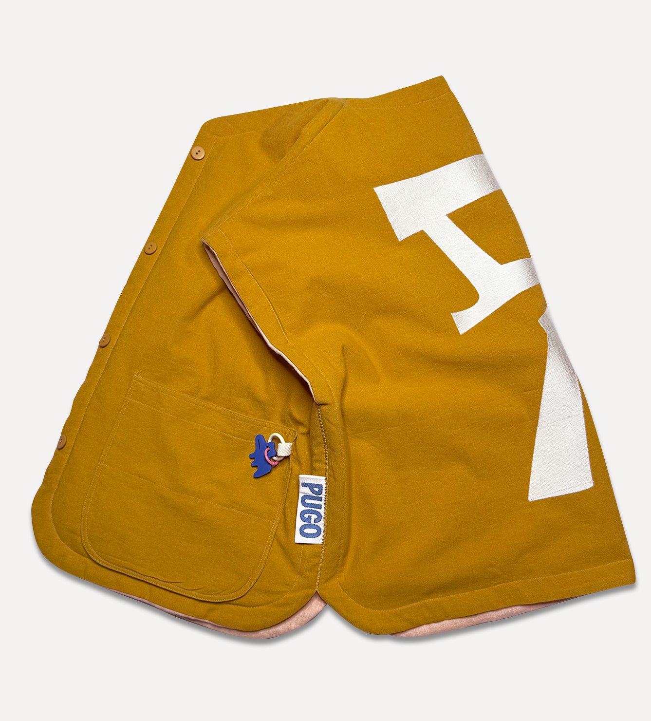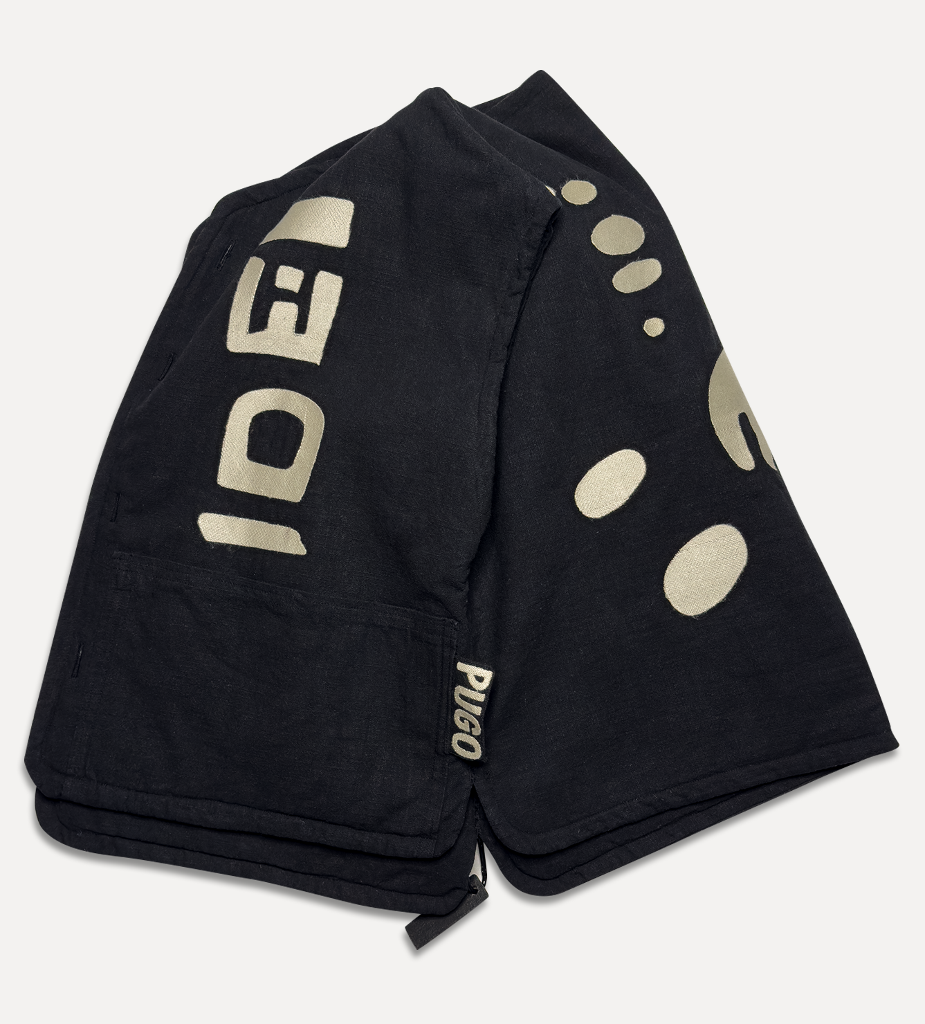 Жилет выполнен из ткани крапива рами с внешней стороны, с аппликацией и вышивкой. Внутри — рубашечный хлопок, утеплитель из хлопка с бамбуком. Стёганая подкладка. Оригинальная графика, пуговицы и брелок.