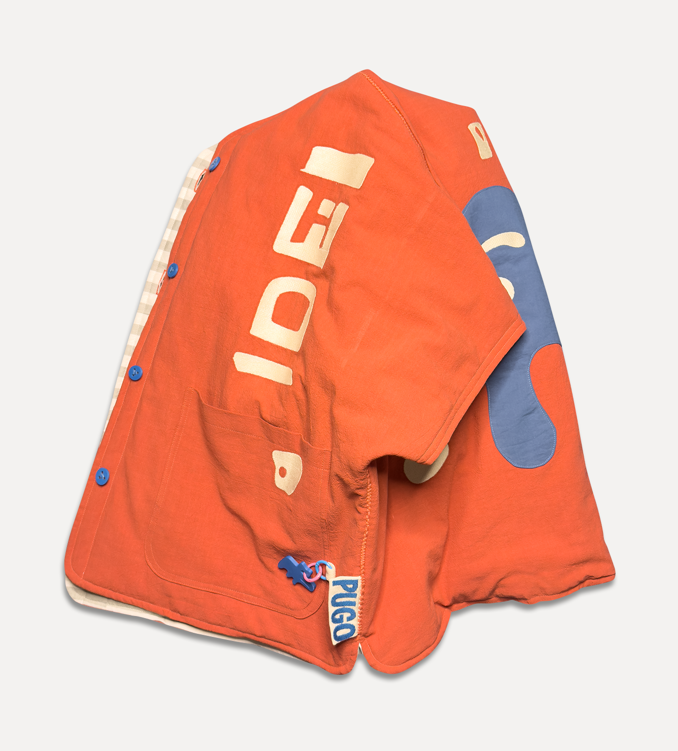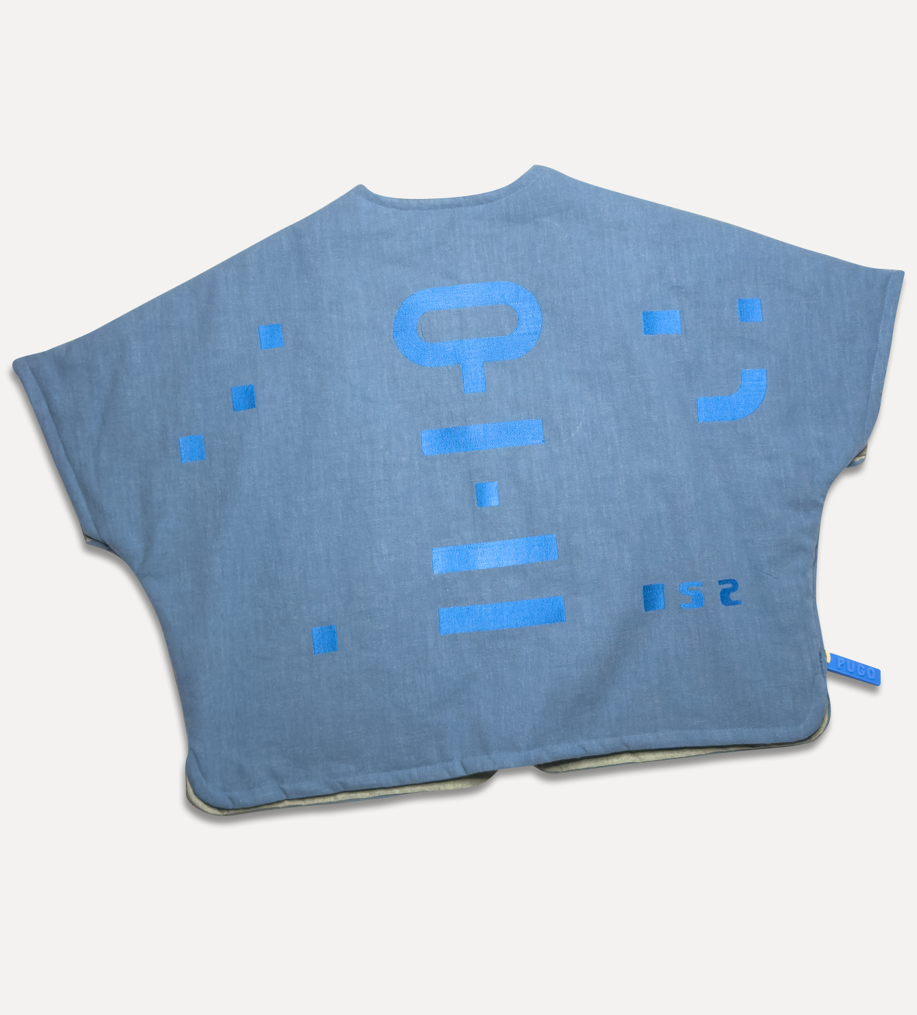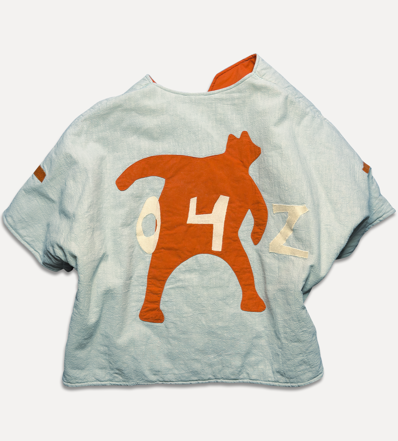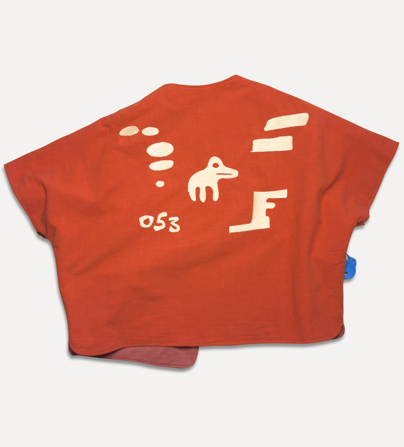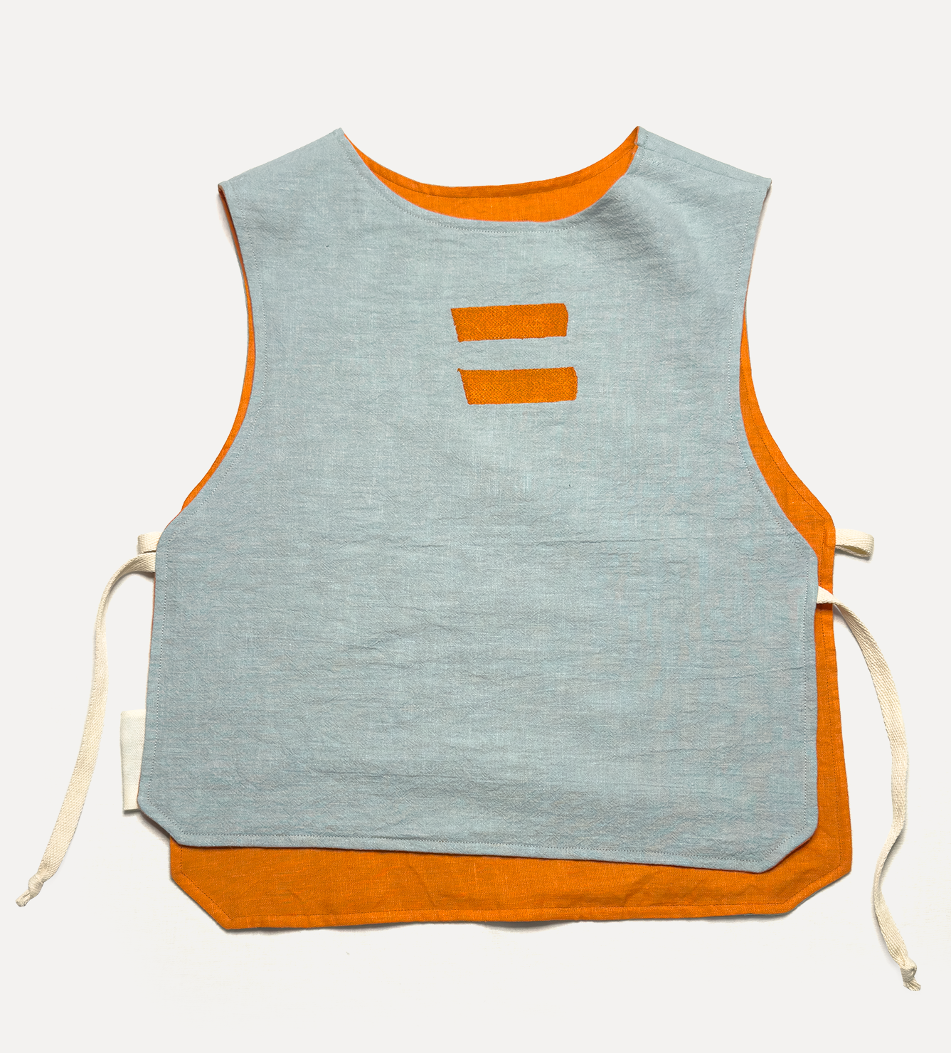 Жилет выполнен из ткани крапива рами с внешней стороны, с аппликацией и вышивкой. Внутри — рубашечный хлопок, утеплитель из хлопка с бамбуком. Стёганая подкладка. Оригинальная графика, пуговицы и брелок.