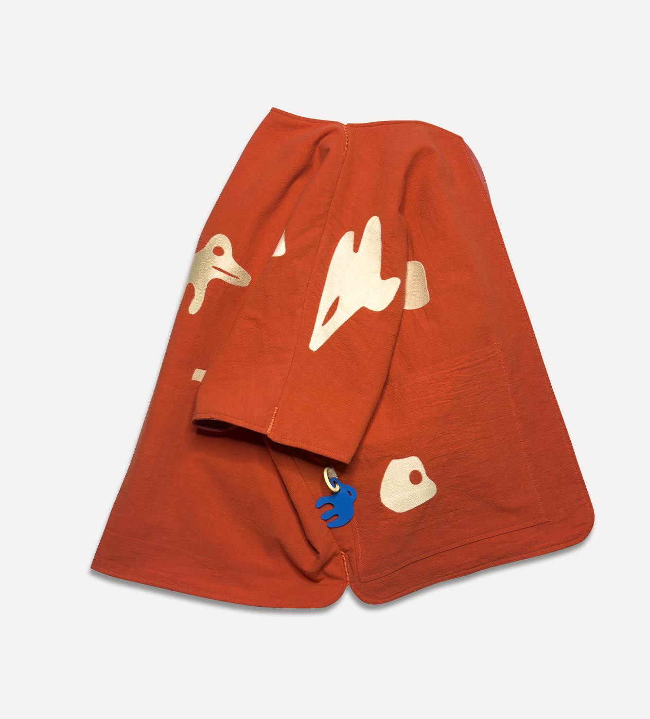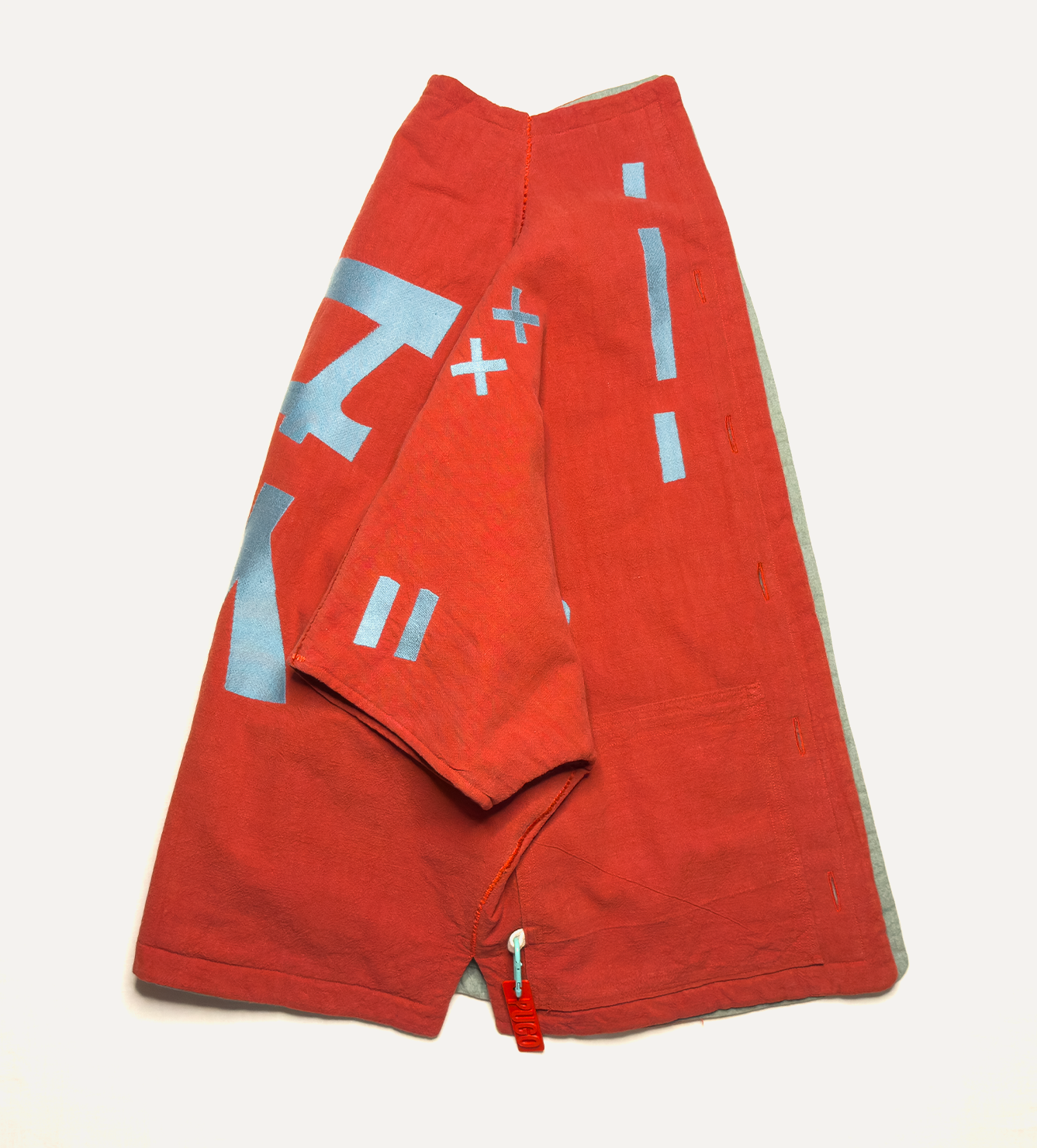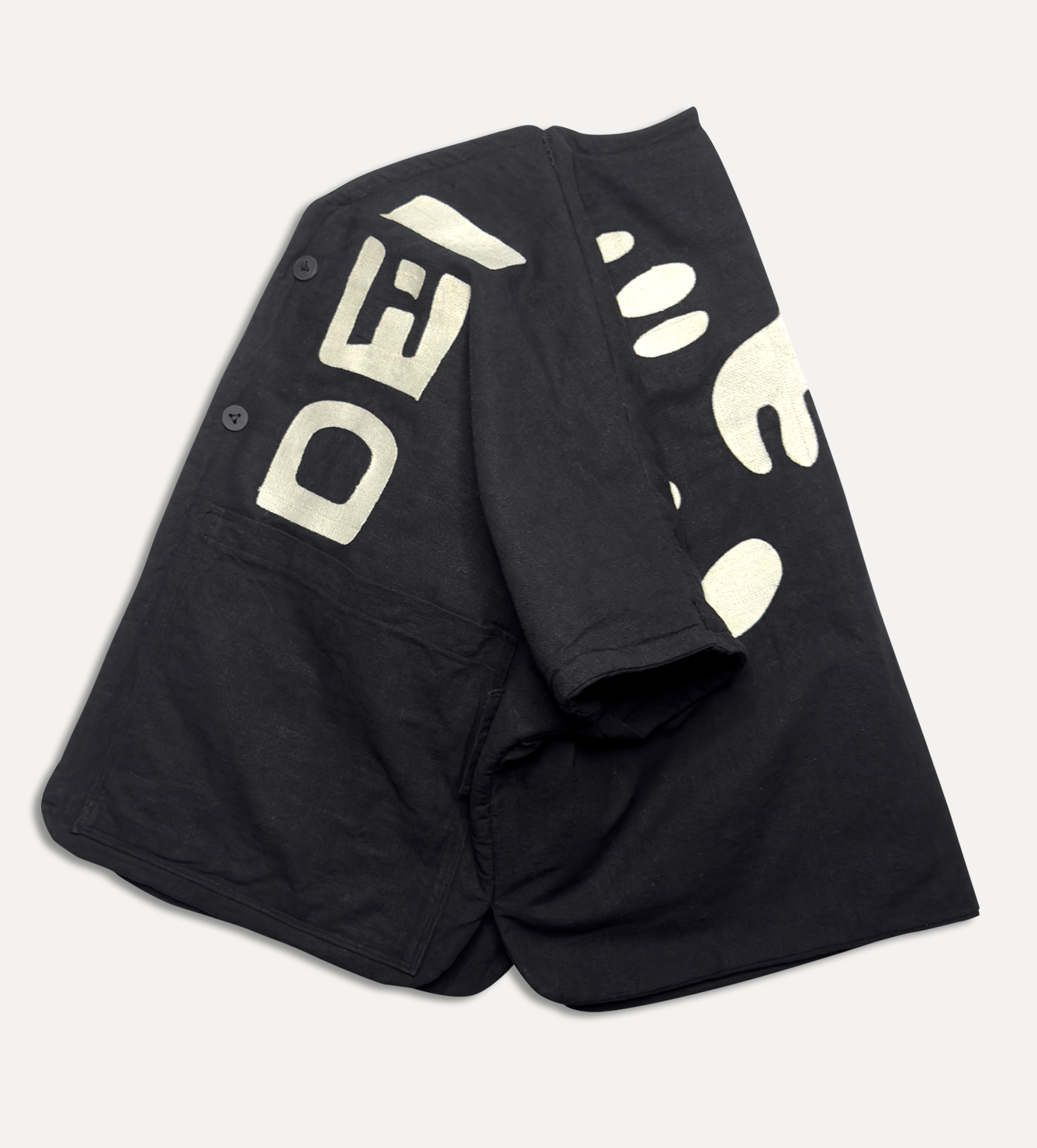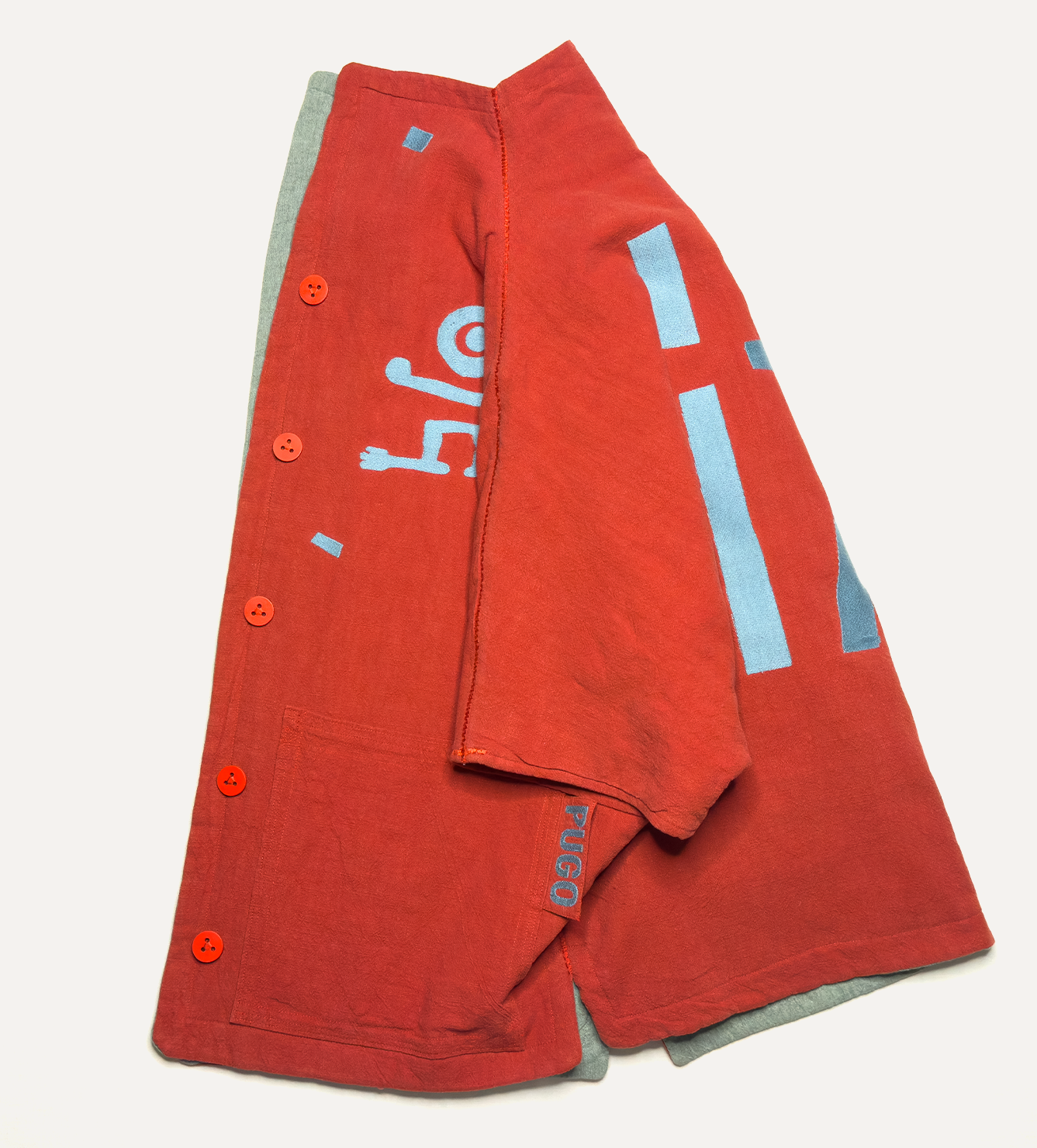 Жилет выполнен из ткани крапива рами с внешней стороны, с аппликацией и вышивкой. Внутри — рубашечный хлопок, утеплитель из хлопка с бамбуком. Стёганая подкладка. Оригинальная графика, пуговицы и брелок.