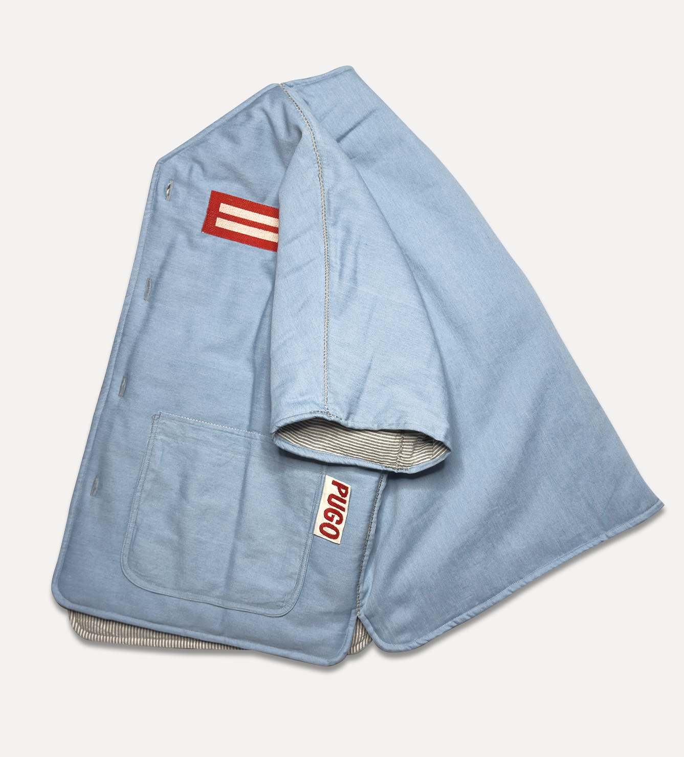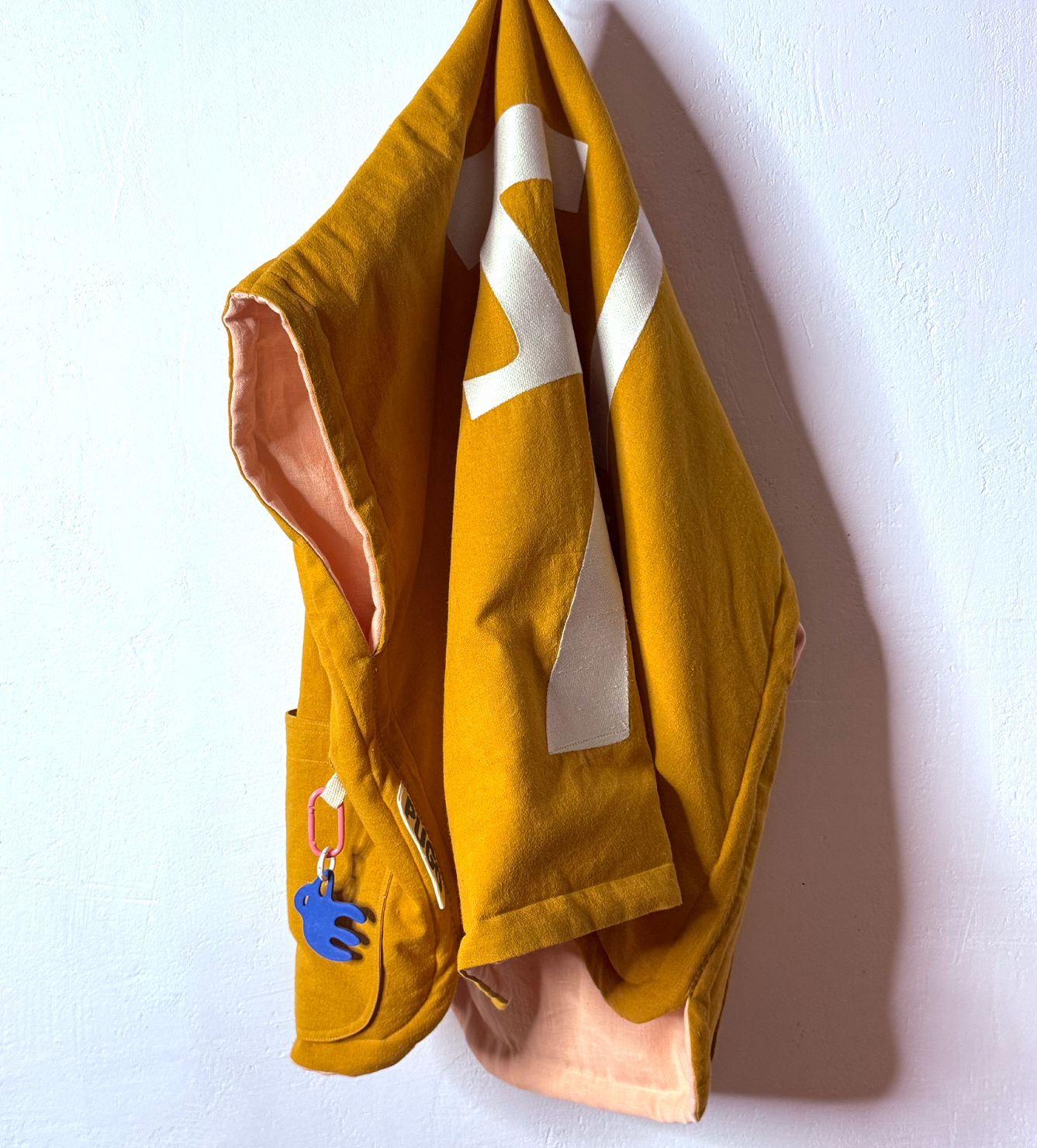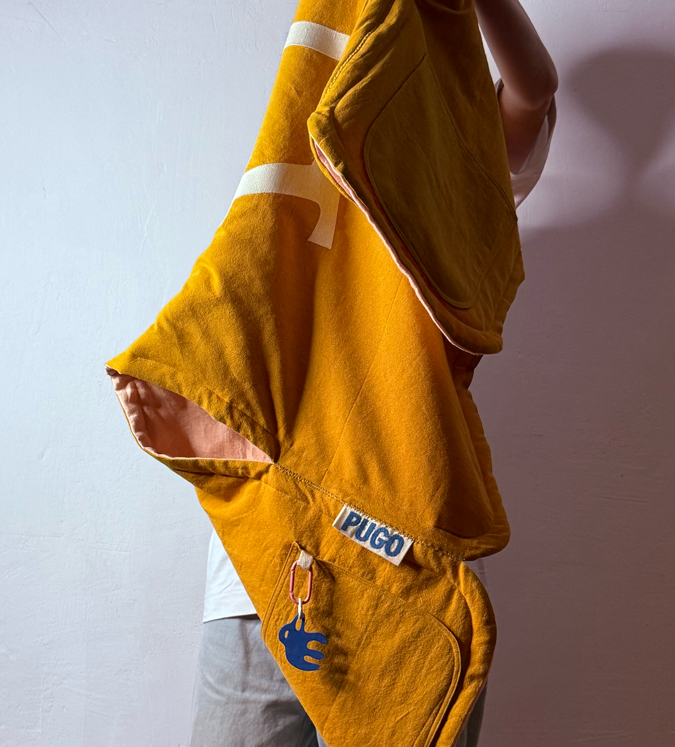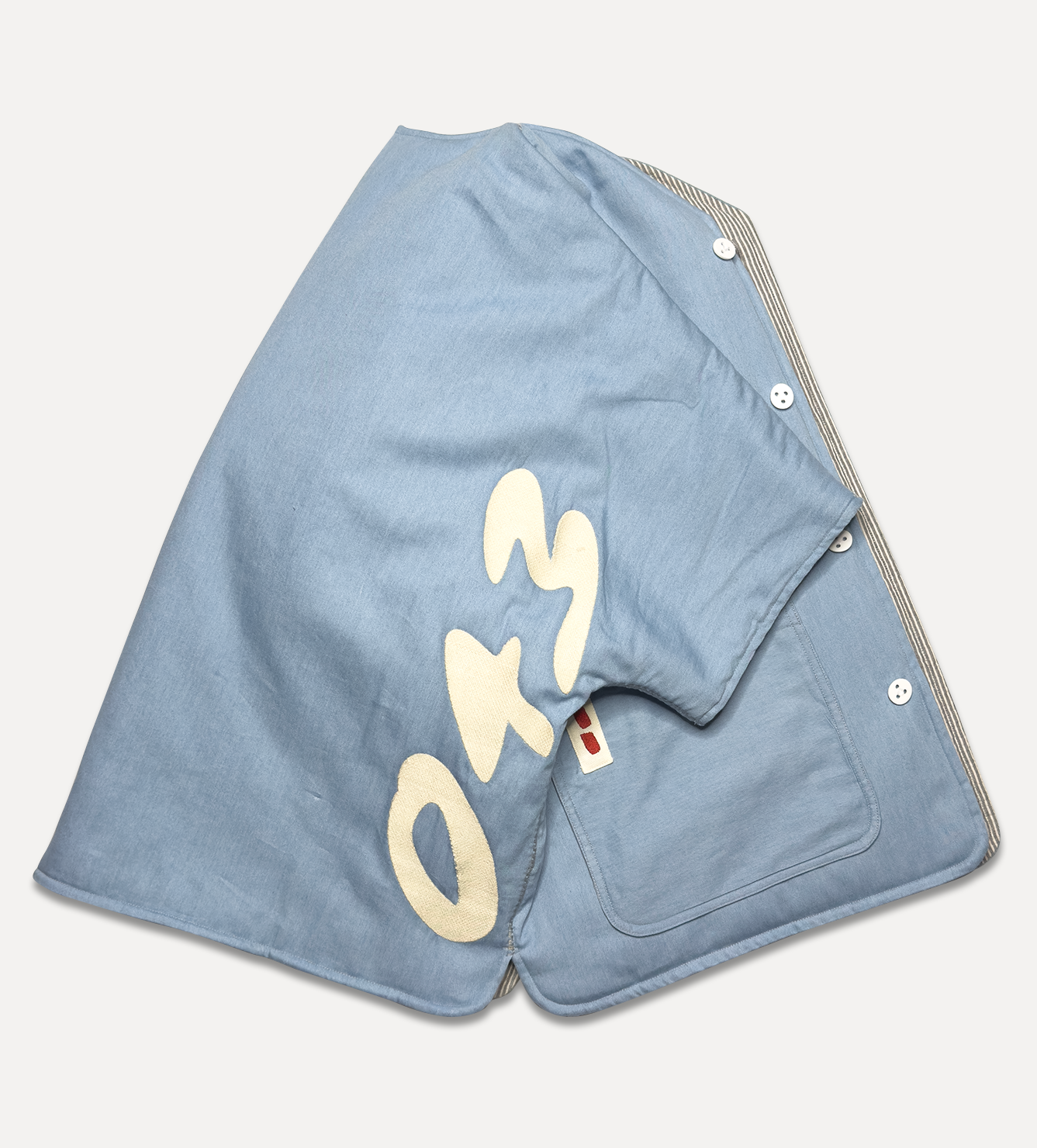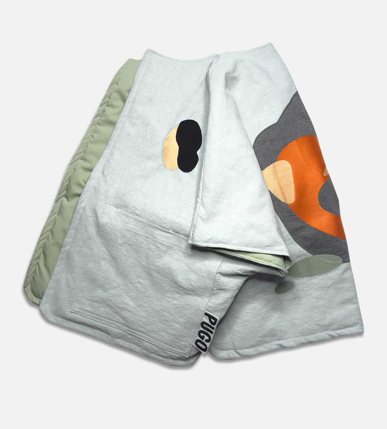 Жилет выполнен из ткани крапива рами с внешней стороны, с аппликацией и вышивкой. Внутри — рубашечный хлопок, утеплитель из хлопка с бамбуком. Стёганая подкладка. Оригинальная графика, пуговицы и брелок.